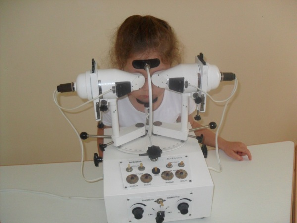 В нашем учреждении с детьми работают воспитатели, владеющие методиками воспитания и обучения детей с патологией зрения, учитель-логопед, педагог-психолог. В медицинском кабинете медсестра-ортоптистка проводит проверку остроты зрения, выполняет лечение на аппарате «синаптофор», который предназначен для диагностики и лечения косоглазия.