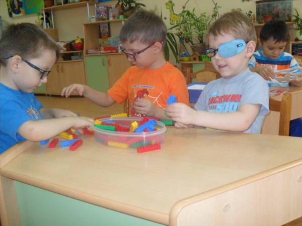 Основная патология воспитанников данных групп — нарушение зрения, поэтому на всех занятиях ставится цель — развитие зрительного восприятия плюс упражнения, снимающие утомление глаз, т.е. организованная учебная деятельность проводится с опорой на остаточное зрение.